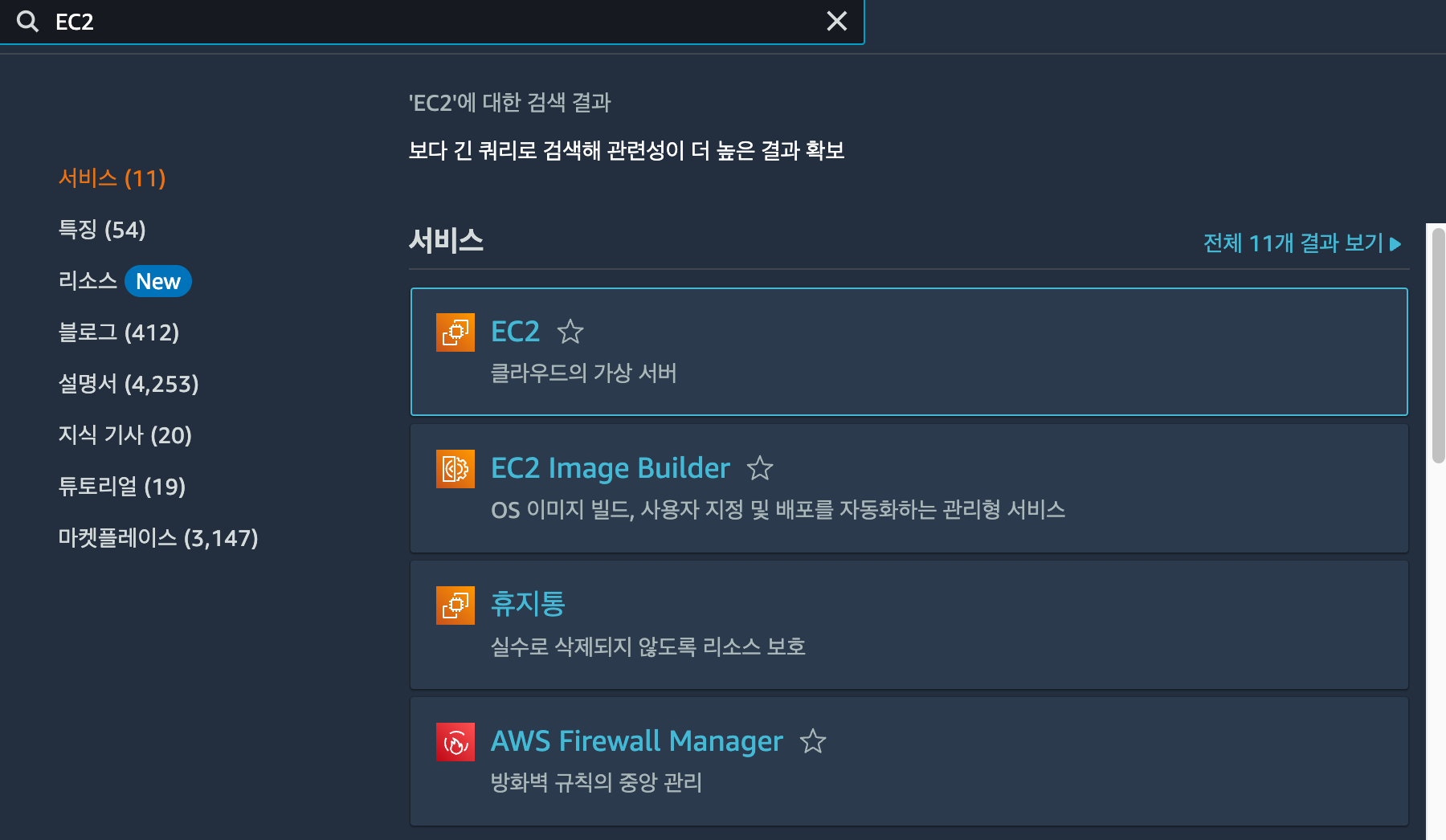 AWS 상단 검색 창에 EC2라고 검색해주시고, 서비스에 EC2를 클릭해주세요.
