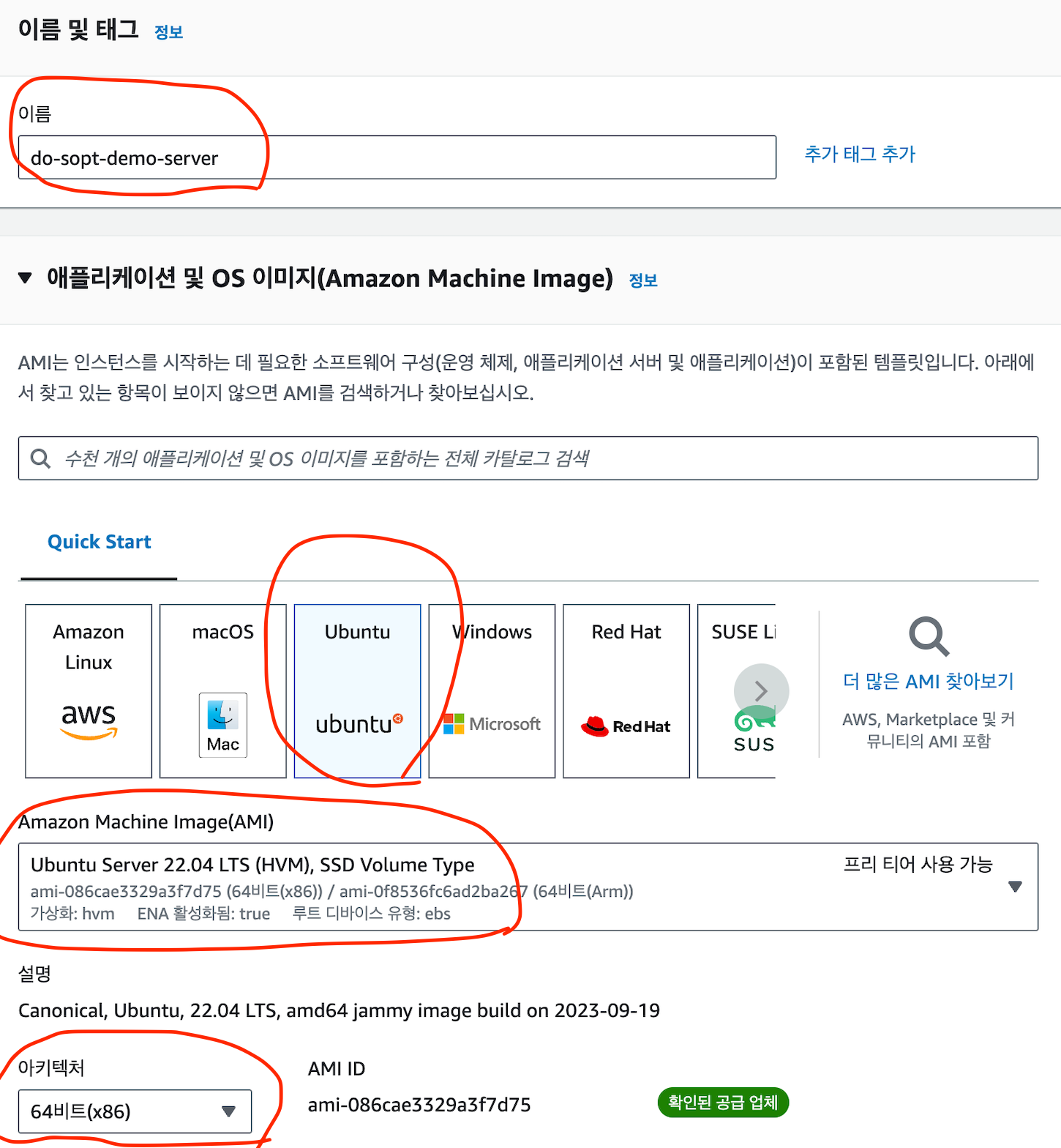 - Amazon Machine Image(AMI) 에서 22.04 LTS 프리티어 사용 가능이라고 되어 있는 옵션을 선택해주세요.