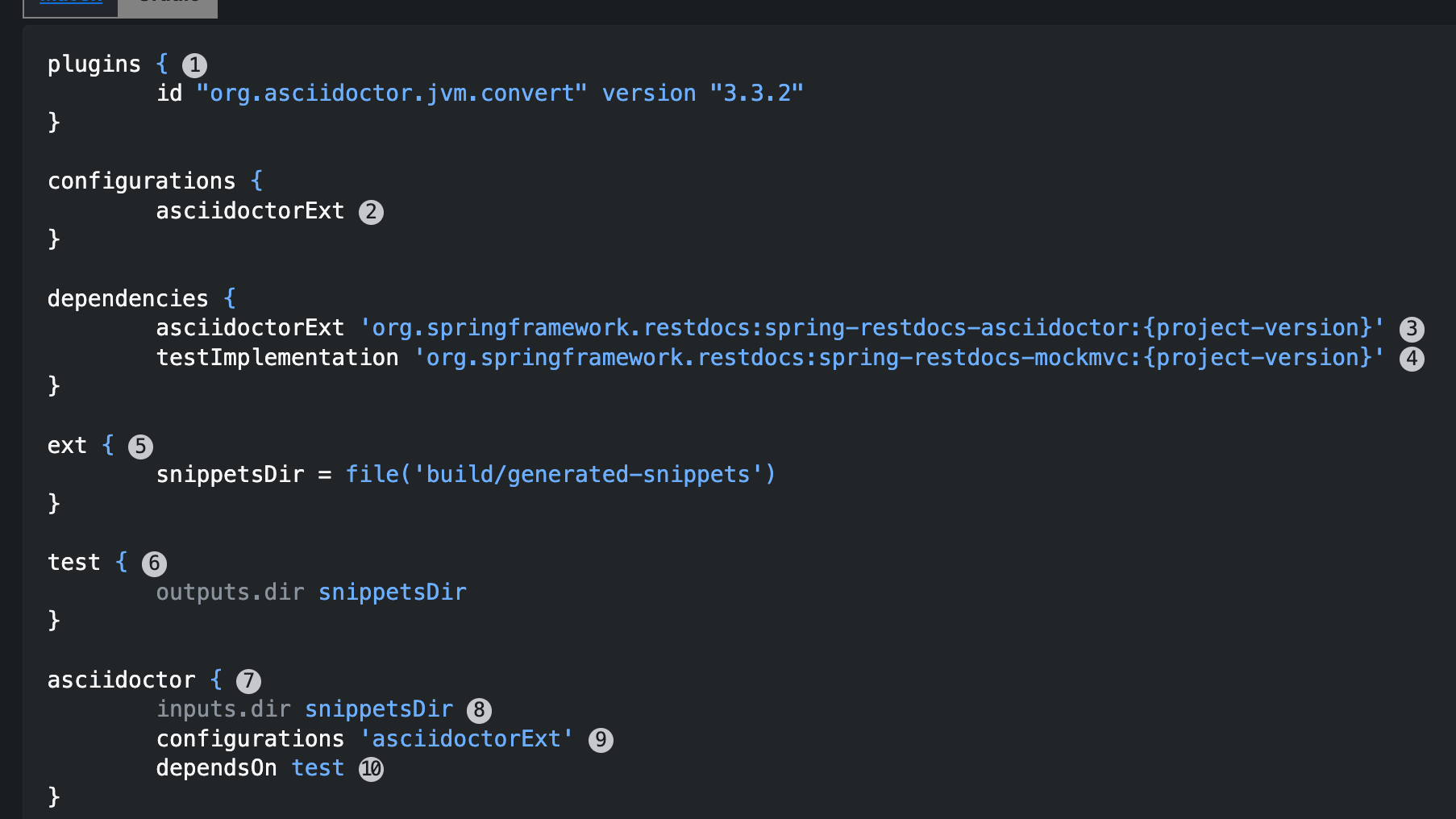 해당 공식문서 기반으로 RestDocs를 적용했다. RestDocs관련 설정을 build.gradle에 추가해준다.